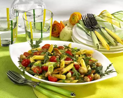 Deglaze with vinegar and season with salt and pepper. Mix chicken fillet, noodles, mushrooms, tomatoes, spring onions and rocket in a bowl and sprinkle with coarsely ground pepper.