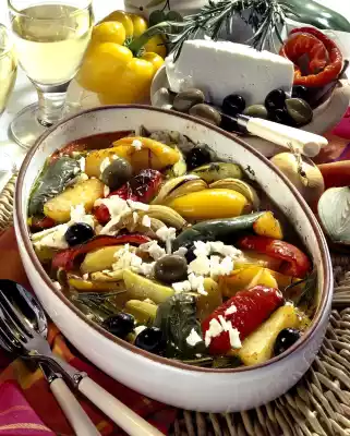 Cook in the preheated oven (electric cooker: 200 °C/ gas: level 3) for approx. 45 minutes. Finely crumble the sheep's cheese. Sprinkle olives and feta cheese over the casserole and serve.