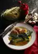 Wash the rosemary, remove the needles from the stems. Mix prepared ingredients and dried herbs. Pour into an ovenproof dish. Dissolve stock in 3/8 litres of hot water, pour on. Drizzle with olive oil.
