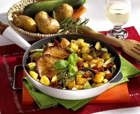 Take out and drain on kitchen paper. Fry the onion in hot oil. Add tomatoes, zucchini and rosemary and fry. Fold in potatoes and mix well. Season with salt and pepper.