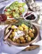 Wash the rosemary, dab dry, pluck the needles from the stems and chop finely. Drain potatoes, rinse with cold water and peel. Heat olive oil in a pan and fry potatoes for 10-12 minutes until golden brown.