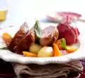 Season with salt and pepper. Take it out. Heat the cooking fat again and fry the meat for 3 minutes, turning it over. Take out. Sauté onion and garlic in the frying fat until transparent. Dust with flour and sauté while stirring.