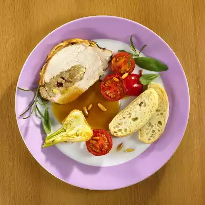 In the meantime, roast the pine nuts in a pan without fat until golden brown, take them out. Wash, clean and halve the tomatoes. Cut the garlic bulb in half. Heat 1 tablespoon of olive oil, fry the tomatoes and garlic for 4-5 minutes. Bring the roasting liquid to the boil and thicken slightly with sauce thickener. Season to taste with salt and pepper. Cut the roast open and serve with sauce, tomatoes and garlic. Garnish with sage and rosemary. Ciabatta bread tastes good with it