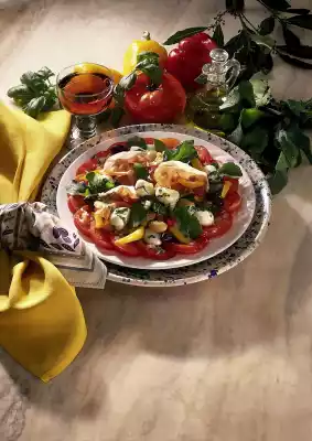 Clean, wash and slice the tomatoes. Line plates with them. Peppers clean, wash and cut into small pieces. Wash and drain the beans. Clean, wash and pluck the rocket into bite-sized pieces. For the marinade, peel and finely dice the onion. Wash and chop the basil.