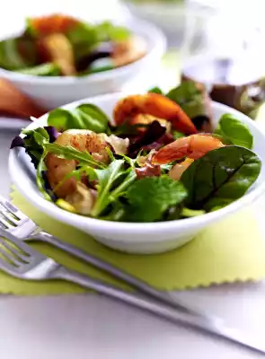 Mix vinegar, honey and mustard, season with salt and pepper. Fold in olive oil. Mix salad, vinaigrette, herbs, shallots and garlic. Arrange salad in bowls. Add the shrimp and ham mix and serve immediately