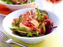 Peel the shrimps, except for the tail fin, and remove the intestines. Wash the shrimps and pat them dry. Cut ham into strips. Wash the salad and drain well. Wash the herbs, shake dry and dab off the leaves. Peel and finely dice the shallots. Peel garlic and chop finely