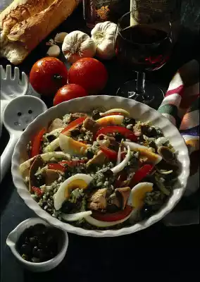 Gradually beat the oil into it. Season with salt and pepper. Drain the rice, rinse with cold water and drain. Mix with the herb sauce, cover and leave to stand for 30 minutes. Drain capers and tuna separately.