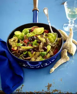 Add olives, tomatoes and meat and simmer at low heat for about 5 minutes. Season to taste with salt and pepper. Wash the basil, shake dry, remove leaves from the stalks and add to the shredded basil.