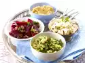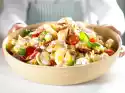 In the meantime cut the mozzarella into cubes. Drain dried tomatoes and dice finely. Wash the basil, shake dry and pluck the leaves. Fold basil, pine nuts, mozzarella and tomatoes into the salad.