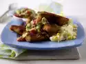 Finely grate the cheese. Wash herbs, pluck, chop. Rinse meat, pat dry. Cover with ham, cheese and herbs. Roll up, bind into shape and season.
