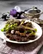 Place the roast on an oiled fat pan. Roast in the preheated oven (electric cooker: 200 °C/circulating air: 175 °C/gas: level 3) for approx. 1 hour. Peel and chop onion. After approx. 20 minutes add to the frying pan. Pour on stock little by little