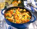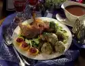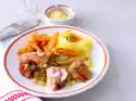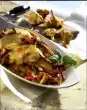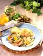 Add tomatoes and diced onion, fry for another 5 minutes. Deglaze with wine and stock, cover and simmer for 5-8 minutes. Stir in cream cheese, season to taste with salt, pepper and vinegar. Serve pasta, rolls and sauce in portions, garnished with basil.