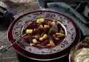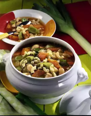 Season with salt and pepper. Fill up with the stock. Cover and cook for about 20 minutes. Rinse and drain the beans. After about 10 minutes of cooking time add noodles, after another 5 minutes add bean seeds.
