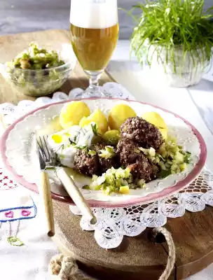 Roast mustard seed in a pan without fat. Take out and let it cool down. Wash potatoes thoroughly and cook in boiling water for about 20 minutes. Knead minced mustard seed, remaining onion, breadcrumbs and egg. Season with 1 1/2 tsp salt and pepper. Form 12 meatballs from the minced meat mixture. Heat 2 tablespoons of oil in a large frying pan. Fry the meatballs on each side for about 5 minutes