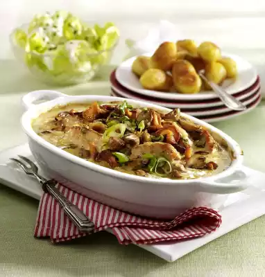 Season with salt and pepper. Deglaze with stock and 200 g cream, bring to the boil, stir in sauce thickener. Bring to the boil again. Put the cutlets in an ovenproof dish, spread mushroom cream over them so that the cutlets are covered.