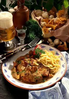 Heat the remaining clarified butter in a pan and fry the escalopes for four minutes on each side. Add the mushrooms to the sauce, heat up and season with salt, pepper and wine. Serve the schnitzels with mushroom sauce. Wash parsley, chop 1/2 bunch finely and sprinkle over the escalopes. Garnish with tomatoes and remaining parsley. Spätzle taste good with it