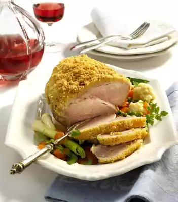 Remove fat edge and rind. Sieve the stock and measure out approx. 1 litre. Knead butter, mustard, egg, breadcrumbs, salt and pepper and spread on the ham. Place on the fat pan. Bake in the preheated oven (electric range: 200 °C/ convection oven: 175 °C/ gas: level 3) for approx. 30 minutes until golden brown. Peel or clean and wash the carrots, cauliflower and spring onions. Cut carrots into slices, divide cauliflower into florets and halve spring onions. Bring the stock to the boil. Simmer carrots and cauliflower for about 10 minutes. Add spring onions and peas and cook for about 5 minutes.