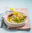 Peel or clean and wash the carrots, cauliflower and spring onions. Cut carrots into slices, divide cauliflower into florets and halve spring onions. Bring the stock to the boil. Simmer carrots and cauliflower for about 10 minutes. Add spring onions and peas and cook for about 5 minutes. Arrange everything with some broth on a plate and garnish with chervil. Potatoes taste good with it