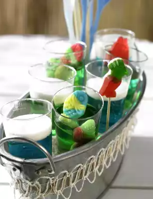 Mix Blue Curaçao with Prosecco and 1 tablespoon of sugar. Squeeze out the gelatine, dissolve carefully and gradually stir in the Prosecco mixture. Divide the fruit gums into 5 disposable shot glasses. Pour in jelly without vodka. Pour into 5 glasses of vodka jelly and into 10 glasses of prosecco mixture. Chill for about 5 hours. Whip the cream lightly and let the vanilla sugar trickle in. Pour into a few glasses as a topping. Keep cool until serving.