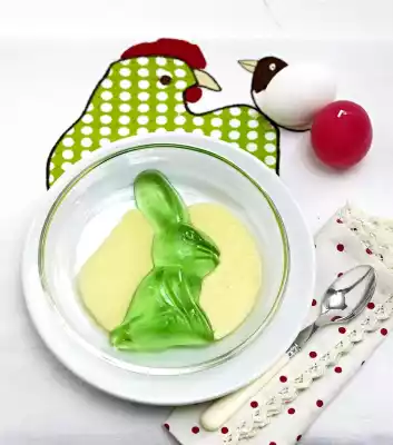 Bring 440 ml milk to the boil. Stir in the sauce powder and bring to the boil briefly. Let the sauce cool down while stirring occasionally. Hold the jelly pans briefly in hot water and turn them out onto a plate. Drizzle with vanilla sauce and serve