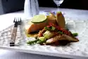 Arrange Jerusalem artichoke, spring onions and fish filet on plates, garnish with the remaining herbs.