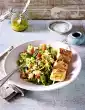 Wash the coriander and mint, shake dry and chop finely except for something to garnish. Wash the chilli and chop finely. Mix coriander, mint, chili, lime juice and teriyaki sauce, season with salt and pepper.