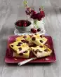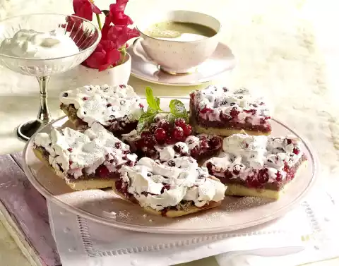 Finally, pour in 200 g sugar and continue beating until the sugar has dissolved and the beaten egg whites are firm. Fold in the currants and spread loosely on the cooled base. Bake in the preheated oven, 2nd shelf from below (electric oven: 175 °C/ convection oven: 150 °C/ gas: level 2) for approx. 35 minutes. Let the finished cake cool down on the baking tray. To cut, dip the knife into a pot of hot water and cut the cake into approx. 20 pieces. Decorate with currants and mint and dust with icing sugar. Lightly whipped cream tastes good with it