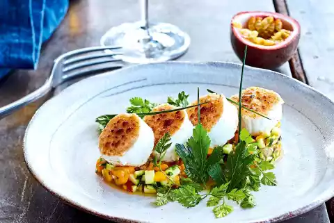 Mix mango, zucchini, passion fruit pulp, ginger, chili, coriander, oil, lime peel and juice. Season with salt, pepper and sugar. Set tartar aside.