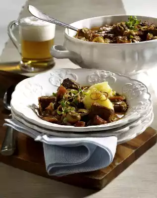 Remove with a skimmer, drain and keep warm. Peel onion and cut into fine rings. Heat a tablespoon of oil and fry the rings until golden brown. Season goulash with salt and pepper.