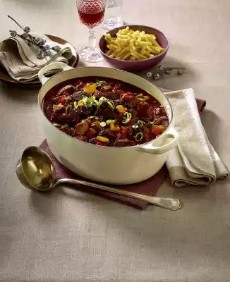 Put all the meat back into the roaster. Add the onions, mushrooms and peppers. Brown everything again, season with salt, pepper and paprika. Add tomato paste, stir-fry and deglaze with red wine and stock.