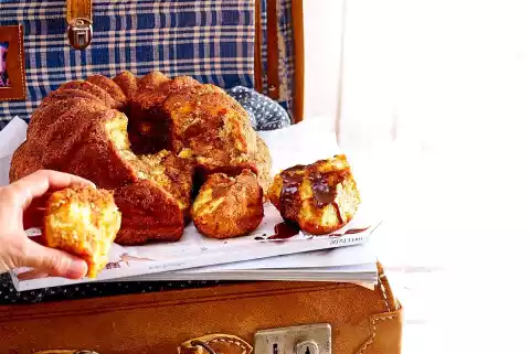 Bake in a hot oven for about 30 minutes. Turn out the finished cake immediately, but do not remove the tin until after about 5 minutes. Leave to cool at lukewarm. Bring the cream to the boil, melt the nougat cream in it. Break off monkey bread pieces and dip them into the nougat cream.