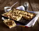Peel, quarter and core 1 kg apples. Roughly grate on a kitchen grater, mix with lemon juice. Mix in 3 eggs, vanillin sugar, 50 g sugar and 75 g double cream. Put them in a cold place. For the dough, mix 100 g butter, salt, lemon zest and 150 g sugar until creamy. Stir in 2 eggs and 50 g double cream one after the other.