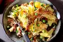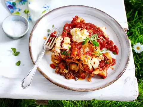 Season vegetables again, let them cool down a little. Remove the bay leaf. Wash oregano, shake dry, pluck off leaves and chop finely, except for a little to garnish. Stir oregano into the tomato sauce and season again.
