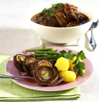 Let one slice overlap each. Spread cucumber quarters and 1/3 of the onion slices evenly on one end of the roulades and roll up the roulades very firmly. Wrap with kitchen string. Heat clarified butter in a roaster.