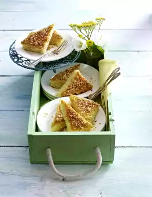 Mix flour, starch and baking powder. Alternately fold flour mixture and yoghurt into the fat-sugar-egg mixture. Spread the dough smoothly on a greased fat pan of the oven (32 x 39 cm). Spread the grated coconut on the dough