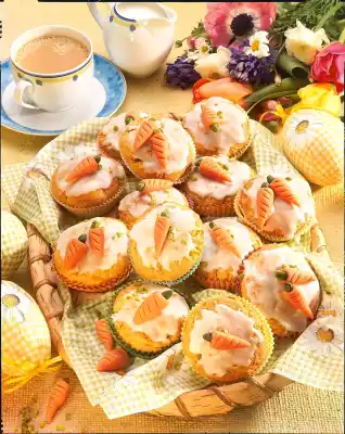 Stir 100 g icing sugar and 2 tablespoons of water until smooth. Spread the muffins with it and let them dry a little. Put 1-2 carrots on top and sprinkle with chopped pistachios