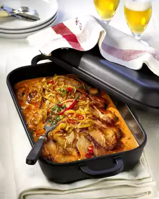 Pour cream and chilli sauce into the roaster. Rinse bottles well with a little water and pour in the sauce. Bring the sauce to the boil and season with chilli fiery. Put the smoked pork loin in it. Cover and stew for about 10 minutes.
