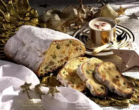 Spread marzipan cubes evenly on top. Form the dough into a stollen. Place the Stollen on a baking tray lined with baking paper and bake in a preheated oven (electric range: 200 °C/ gas: level 3) for 60-70 minutes.