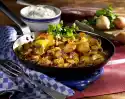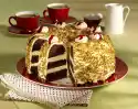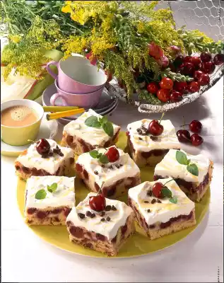 Let them cool down. Whip the sour cream, cream and vanilla sugar until stiff and spread on the cake in waves. Pour the rest of the egg liqueur into a freezer bag and cut off a small corner. Decorate the cake surface with it. Cut the cake into pieces and serve decorated with cherries, chocolate chips and mint as desired. Results in about 20 pieces