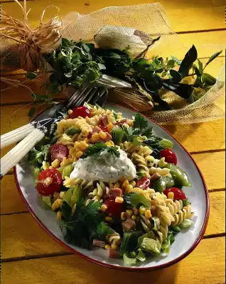 Cook the pasta in boiling salted water for about 10 minutes until al dente. Then rinse with cold water and drain. Place in a salad bowl. Mix in the halves of the herbs. In the meantime, clean and wash the celery and cut it into small pieces. Blanch in boiling salted water for about 2 minutes, drain. Pour the corn onto a sieve, rinse cold and also drain well. Add celery and corn to the noodles. Bring the vegetable stock to the boil. Season to taste very spicy with vinegar, pepper and some fenugreek. Stir in olive oil. Pour hot over the salad ingredients and let it soak through a little. Clean, wash and possibly halve the tomatoes. Dice ham finely. Clean and wash the endive salad, drain well and cut into fine strips. Arrange on a plate. Add diced ham to the pasta salad. Serve on a plate. Mix salad cream, yoghurt and remaining herbs. Season to taste with salt and pepper. Add to the salad as a blob or mix in as you wish. Garnish with parsley as desired