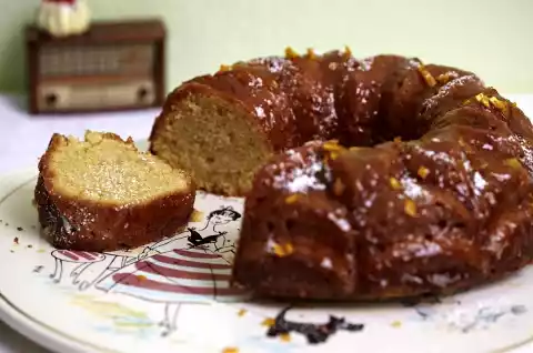 For the syrup squeeze oranges and lemon. Heat up the juices in a pot and dissolve the powder in it. Prick the finished cake several times and sprinkle with syrup. Let it cool down