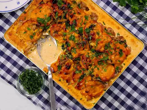 Cover everything with cheese. Bake in the preheated oven (electric cooker: 250 °C/ convection oven: 225 °C/ gas: level 5) on the lower rack for approx. 45 minutes. Mix the cream with both sauce powders and pour over the escalopes approx. 10 minutes before the end of the cooking time.