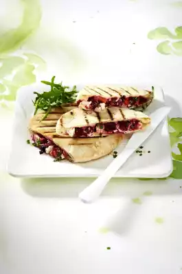 Warm the bread in the toaster, cut it open at the mark and fill it with the vegetables. Grill in a hot grill pan (or a coated pan) from both sides for 4-6 minutes, weighting down with a pot.