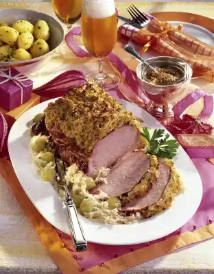 Mix cooled onions, eggs, sugar, mustard and breadcrumbs. Season with salt and pepper. Remove the pork loin, spread the onion mixture on top and bake in a preheated oven (electric cooker: 200 °C/ gas: level 3) for a further 20 minutes.