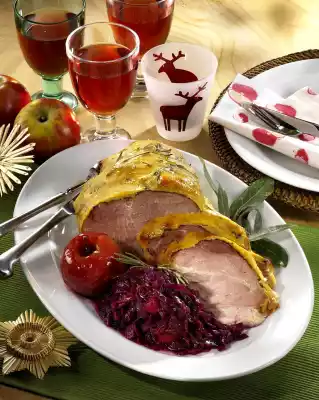 Add laurel, cloves and apples. Cover and stew for about 30 minutes. Remove ham from the stock. Let it cool down a bit. Measure 1/8 litre brew and pour into the cabbage. Remove the rind from the meat. Remove rosemary needles and chop. Mix 1 tablespoon sugar, mustard, eggs, rosemary and breadcrumbs. Spread the paste on the ham. Bake in the preheated oven (electric cooker: 200 °C/ gas: level 3) for 15-20 minutes. Season cabbage and serve with ham. Garnish with herbs and steamed apple if desired. Boiled potatoes taste good with it