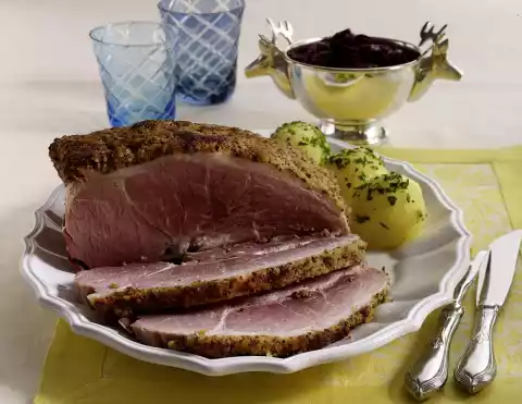 Heat the lard in a pot and fry the onions. Add red cabbage, bay leaf and apple juice. Flavour with vinegar, salt and sugar. Bring to the boil and simmer for 30-45 minutes. Add apple sauce 10 minutes before the end of cooking time. Remove ham from the stock. Cut off rind and fat edge. Mix butter, honey and mustard. Season with salt. Finely chop the toast with the universal chopper, stir in, spread on the roast and press down. Bake in the preheated oven (electric cooker: 200 °C/ convection oven: 175 °C/ gas: level 3) for 20-30 minutes. For the dumplings, shape the package contents into small dumplings with moistened hands and place in plenty of boiling salted water.