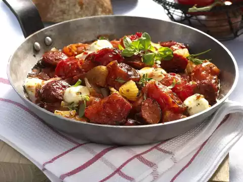 Drain the mozzarella. Cut Kabanossi into thick slices. Wash the tomatoes and cut into large pieces. Peel onions, also cut into large pieces. Peel garlic and chop finely.
