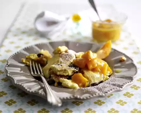 Beat the egg whites until stiff and add 1 tablespoon of sugar. Fold the beaten egg whites into the dough. Heat butter in a pan. Pour in the dough and sprinkle raisins evenly on top.