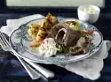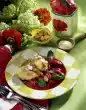 Peel and finely chop the ginger. Cut mango pulp from the stone and peel. Dice from the large pieces, chop small pieces finely. Caramelise 50 g sugar in a pot. Deglaze with orange juice, add chopped mango and ginger and simmer until the sugar is dissolved. Remove from heat, season with lemon juice and curry. Let the compote cool down