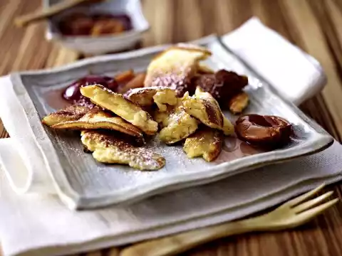 Sprinkle with 1 tablespoon of sugar and lightly caramelise while tossing. Arrange Kaiserschmarrn with some compote. Dust with icing sugar. Add the rest of the compote.